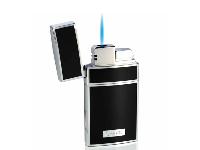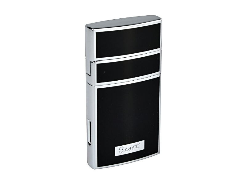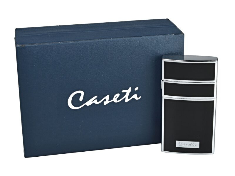 Elegáns lakkfekete Caseti Nizza szivaröngyújtó. A kiváló minőségű Caseti Nizza szivaröngyújtó fekete-króm fényes kombinációban készült. A fedél kinyitásakor a gombot megnyomva a szúróláng meggyullad. Az öngyújtó alsó részén megtaláljuk a gáz utántöltő szelepet és a lángszabályozó csavart.