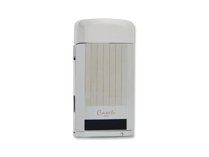 Caseti szivaröngyújtó króm, csíkos mintával, piezo elven működő, újratölthető, alján kihajtható szivarfúróval. Állítható lángméretű.