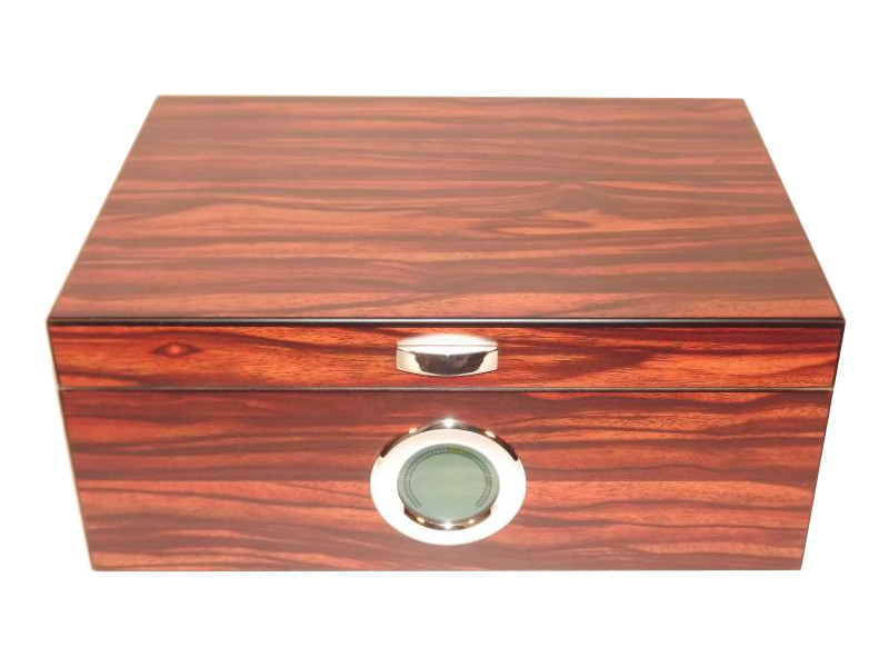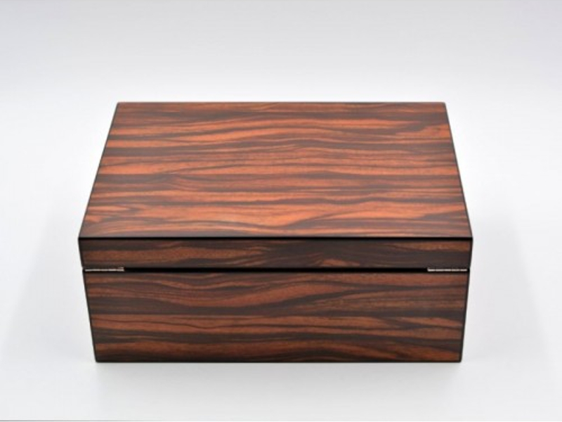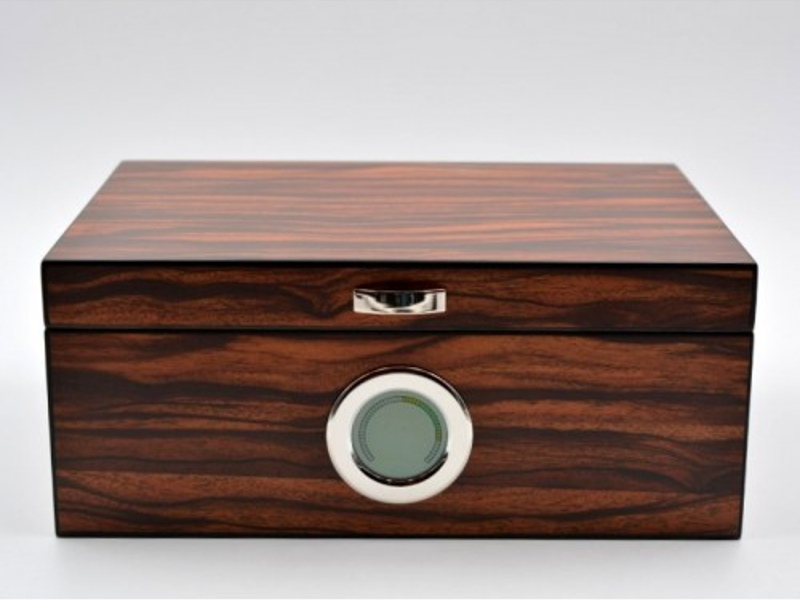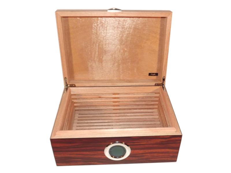 Exkluzív barna színű, csíkos luxus szivar tartó doboz kb. 50 szivar tárolására alkalmas (a szivargyűrű mérettől függően). Angelo szivar tartó humidor, rácsos spanyol cédrusfa belsővel és elválasztó léccel. Külső digitális hygrométerrel és süllyesztett zsanérokkal.