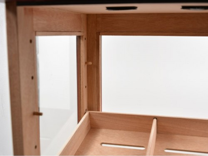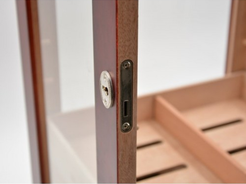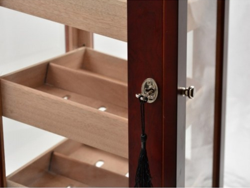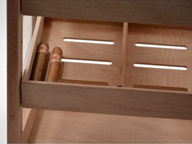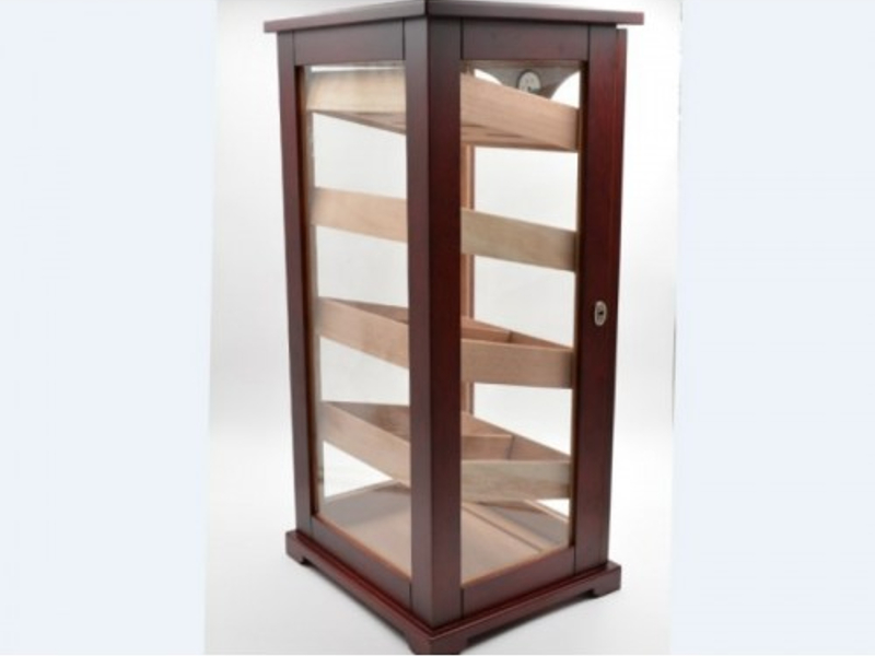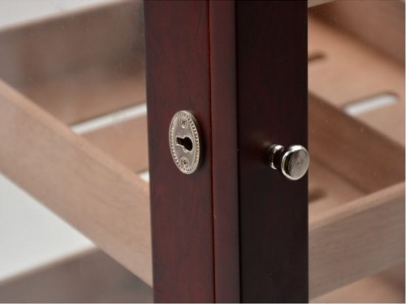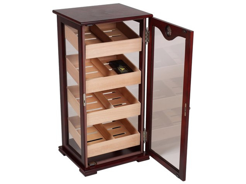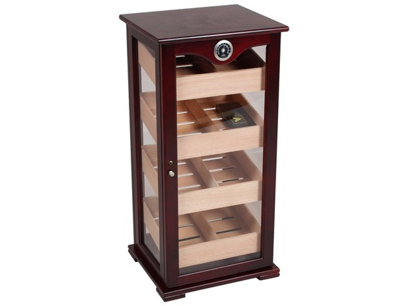 Nagy méretű szivar tartó szekrény, kb. 150 szál szivar tárolására. A humidor szekrény mind a négy fala üveges, belseje cédrusfa, valamint 4 db cédrusfából készült döntött fiókkal. A fiókok magassága állítható, így akár szivardobozokat is tudunk benne tárolni. A fiókok tartalmaznak választó lécet és úgy vannak kialakítva, hogy a levegő tudjon benne cirkulálni. Így biztosítják a szivaroknak a megfelelő klímát, ami az szivarok éréséhez szükséges. A szekrény ajtajába van beépítve egy fehér számlapos higrométer. A szivar szekrény tetejében pedig az Akrylpolimer kristályt tartalmazó párásítót tudjuk elhelyezni tépőzárak segítségével, amennyiben ezt szeretnénk. Az ajtókeret belülről, körben légzáró betéttel ellátott, ami azt a célt szolgálja, hogy a szivar tároló szekrény ne karcolódjon. Az ajtó mágneszáras és kulccsal zárható.