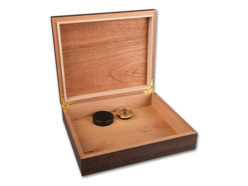 Humidor 30 szál szivar részére, diómintás szivartartó doboz, párásító és belső hygrometer – Achenty!