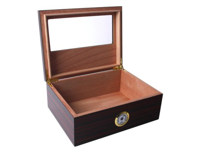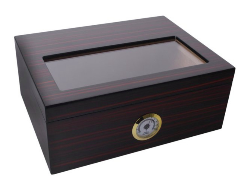 Sötétbarna, ébenfa hatású spanyol cédrusfa humidor 40 szivar tárolására. A szivar tároló doboz teteje üvegbetétes.