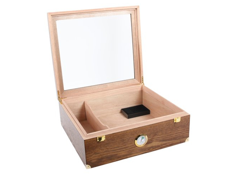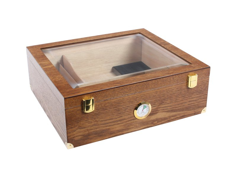 Kb. 40 szivar tárolására alkalmas, bordó színű cédrusfa humidor. Szivar tároló doboz üveg tetővel, szivacsos párásítóval és külső hygrometerrel.
