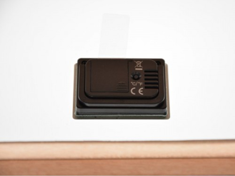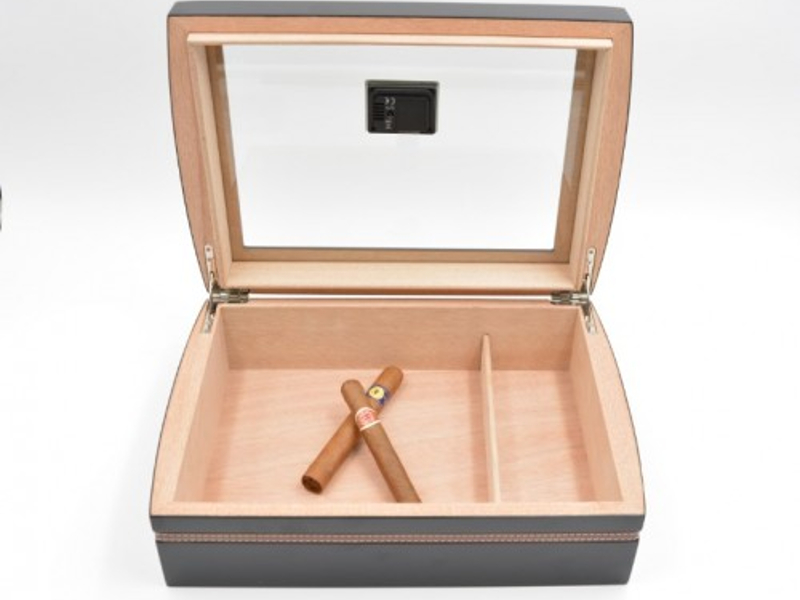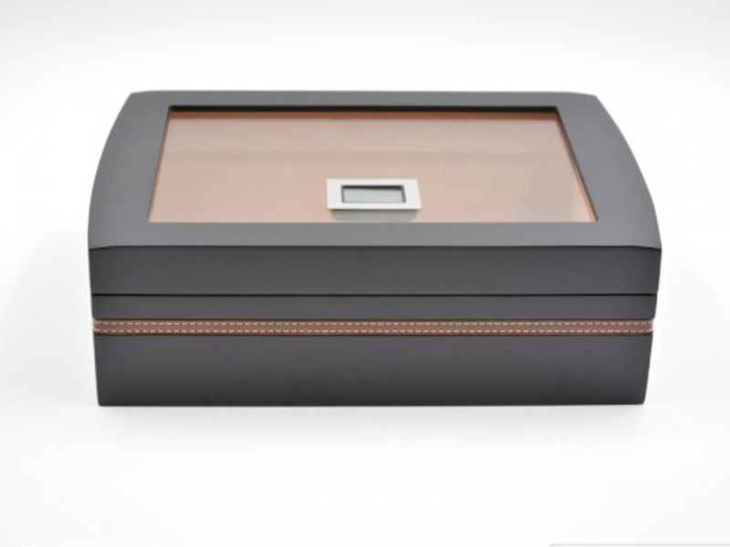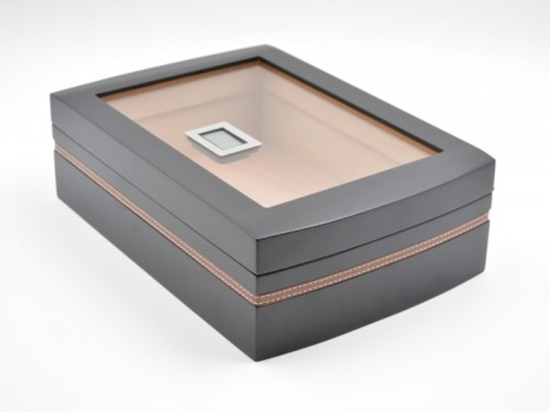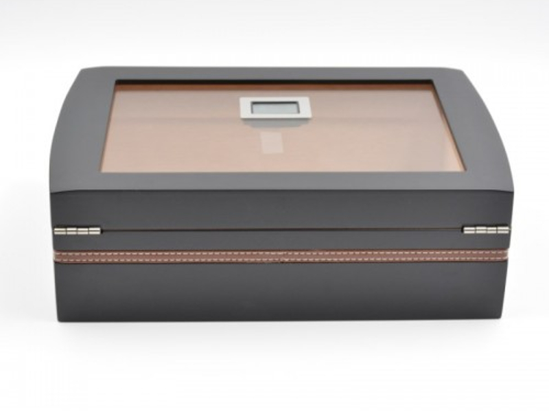 Fekete színű, masszív cédrus szivar tartó doboz bőr borítással, amely kb. 40 szál szivar tárolására alkalmas. Az üvegtetőbe van beépítve a digitális hygrométer és a hőmérő. A hőmérséklet állítható Fahrenheit illetve Celsius (ºF vagy ºC) . Az oldalán körbe egy elegáns, varrott barna vékony bőrcsík díszíti, fehér varrással. A humidor alja fekete filccel van bevonva, hogy megóvja a bútorokat a karcolódástól. A humidor tartalmaz egy akrylpolimer kristály párásítót és egy választó lécet is. Süllyesztett króm színű zsanérokkal.