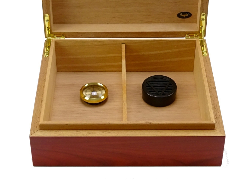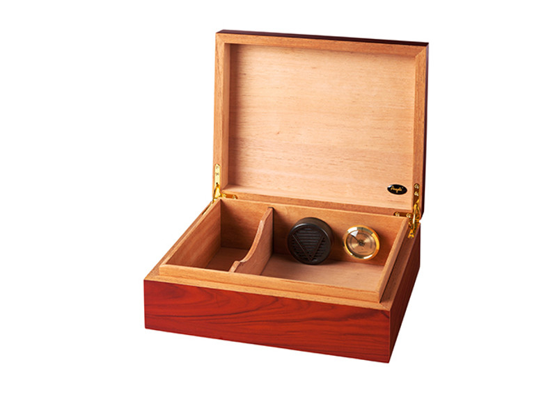 Vöröses barna színű szivar tartó doboz, ami kb. 50 szivar tárolására alkalmas (szivar gyűrűméret – átmérőtől függően). A szivar tartó humidor belseje spanyol cédrusfa, külseje bubingafa bevonattal. Belső beépíthető hygrométerrel valamint akrylpolimer kristályos párásítóval van felszerelve.