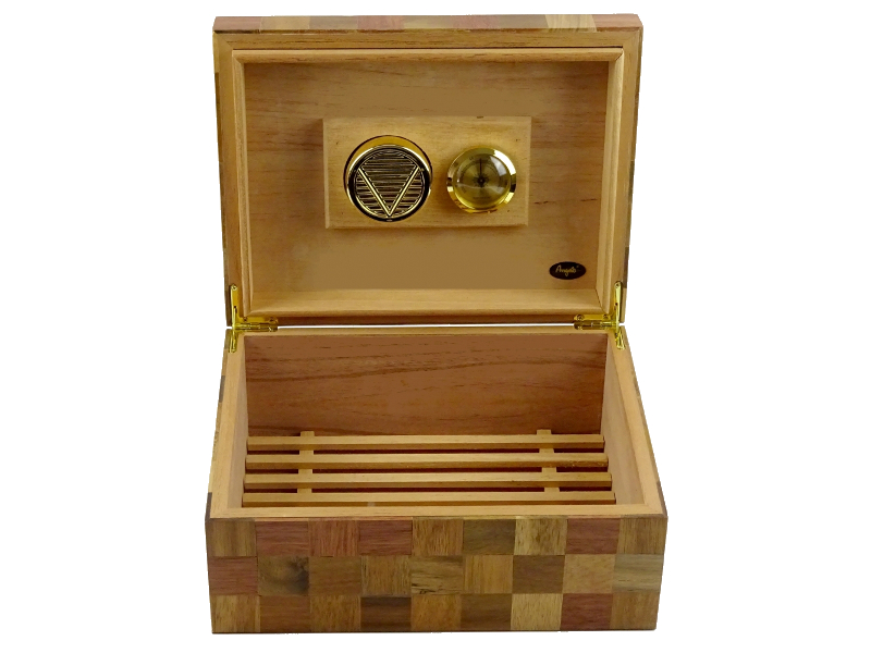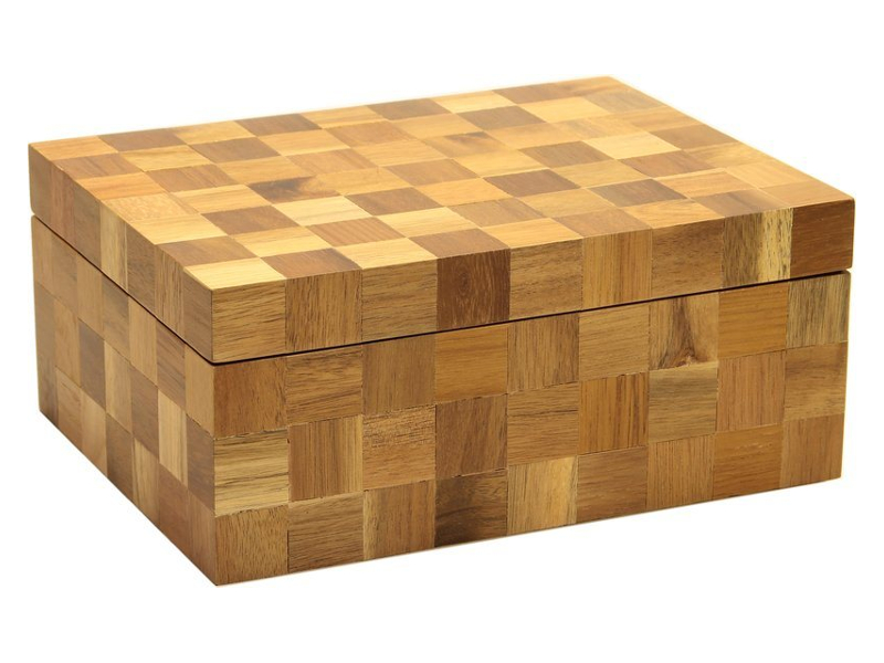Világosbarna színű, kézzel készített, dekoratív, harmonikus kockás mintával díszített humidor, 50-60 szivar tárolására.