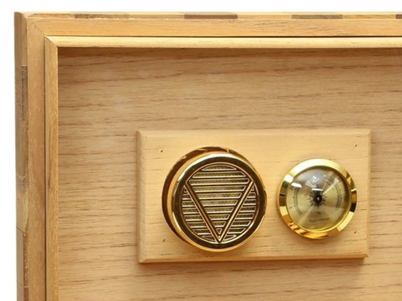 Tetejébe beépíthető arany színű akrilpolimer kristályos párásítót és nagyméretű, aranykeretes hajszál-hygrométert tartalmaz.