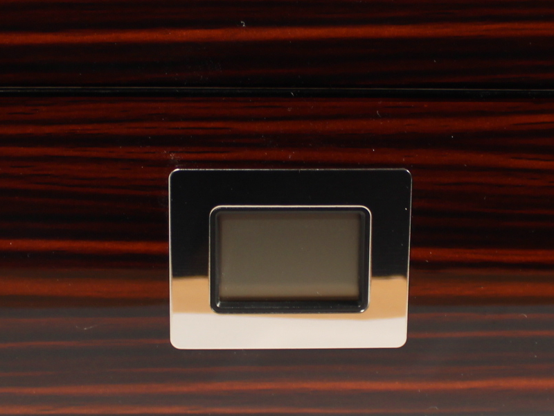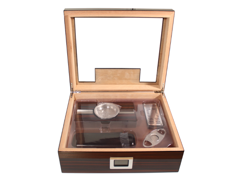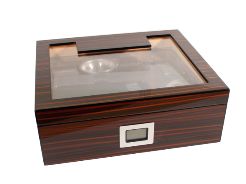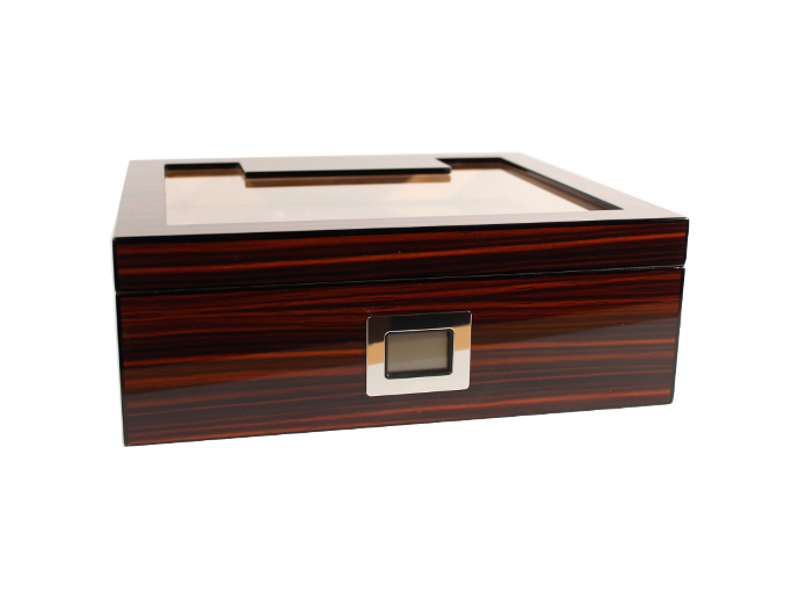 Sötétbarna-fekete csíkos, lakkozott, üvegtetős spanyol cédrusfa szivar tartó doboz 50 szivar tárolására
