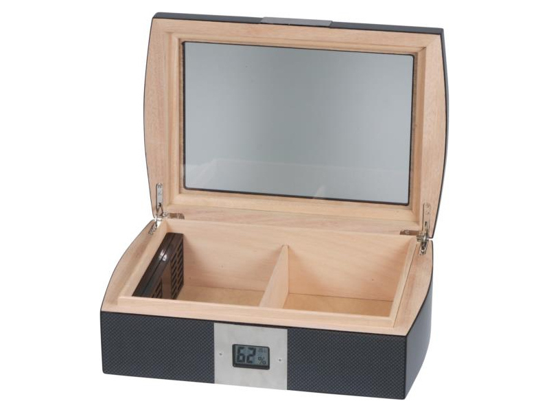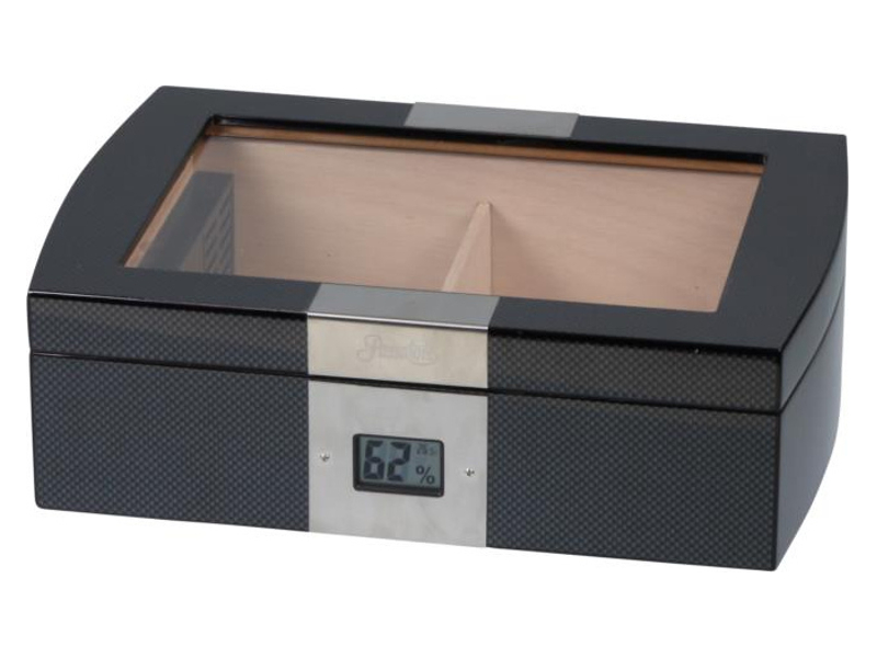 Exkluzív, fekete színű carbon, Passatore szivar tartó doboz üveg tetővel és extra minőségű rozsdamentes acél szalaggal díszítve. A szivar tartó humidor kb. 50 szivar tárolására alkalmas, spanyol cédrusfa belsővel és elválasztó léccel rendelkezik. Külső digitális hygrométerrel és süllyesztett zsanérokkal.