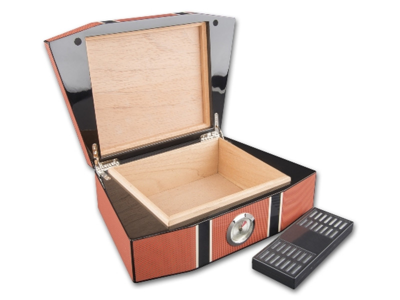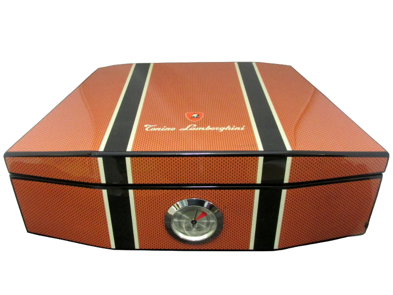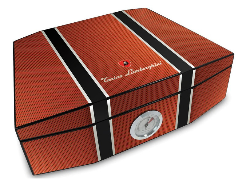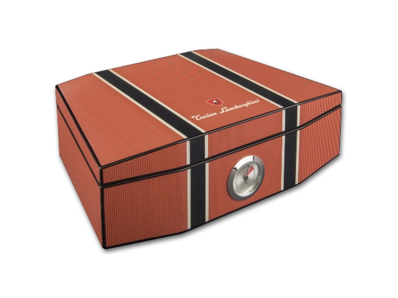 Gyönyörű narancs és carbon mintás lakkozott, Lamborghini szivar tartó doboz fekete díszítéssel. A szivar tartó humidor kb. 50 szivar tárolására alkalmas, spanyol cédrusfa belsővel és elválasztó léccel rendelkezik. Külső hygrométerrel és süllyesztett zsanérokkal.