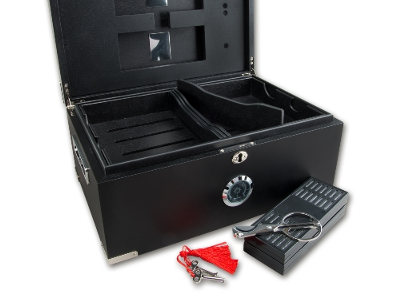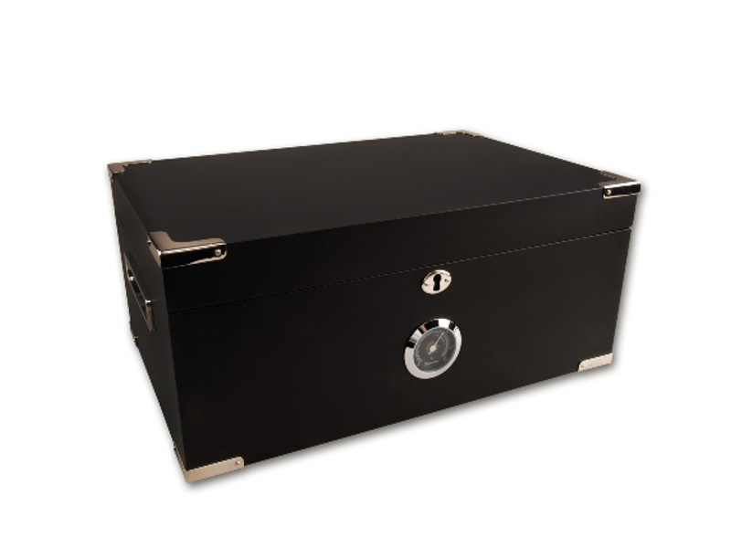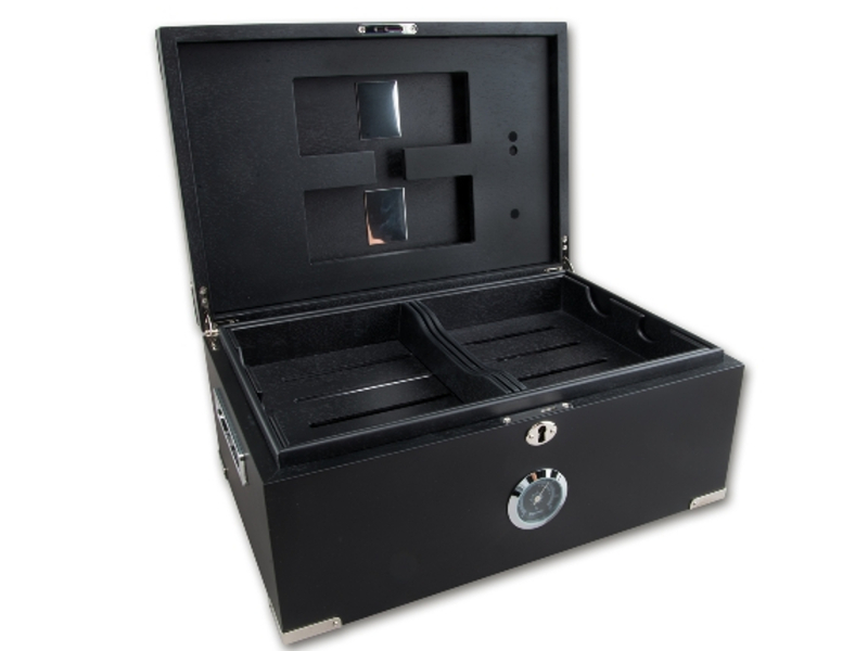 A humidor kétszintes: tartalmaz egy kivehető cédrusfából készült tálcát, amely a két darab léccel három részre is elválasztható, valamint az alsó szinten is van egy elválasztó léc. A teteje kulccsal zárható, az oldalán 2 ezüst színű fogantyúval. Süllyesztett, stabil, krómozott négyszögletes zsanérokkal, krómozott sarokvédőkkel. 2 db beépíthető akrilpolymer kristályos párásítót és belső hygrométert tartalmaz.