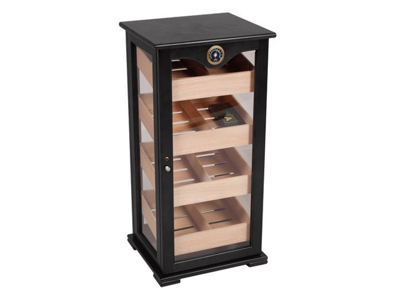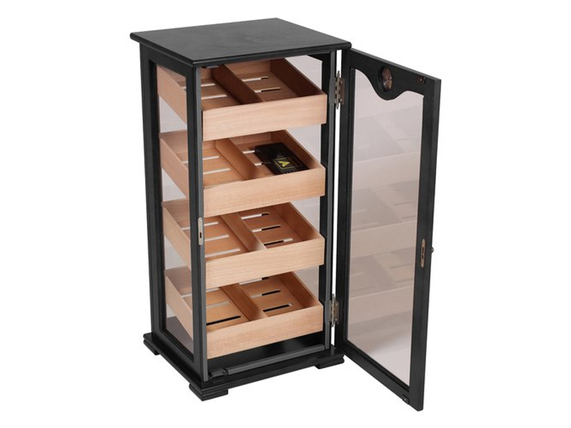 Nagy méretű, fekete színű szivar tartó szekrény, kb. 150 szál szivar tárolására alkalmas. A humidor szekrény mind a négy fala üveges, belseje cédrusfa, valamint 4 db cédrusfából készült döntött fiókkal.
