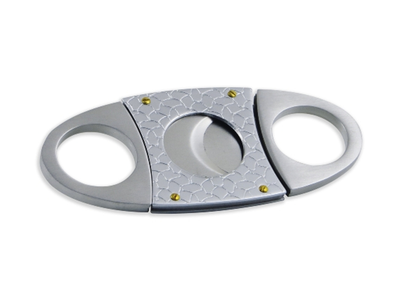 Guillotine elvű, kétujjas nemesacél szivarvágó, mozaikos mintával.