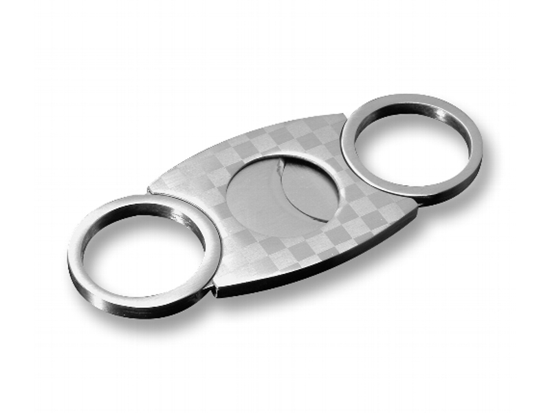 Guillotine elvű, kétujjas nemesacél szivarvágó, négyzetrácsos mintával.