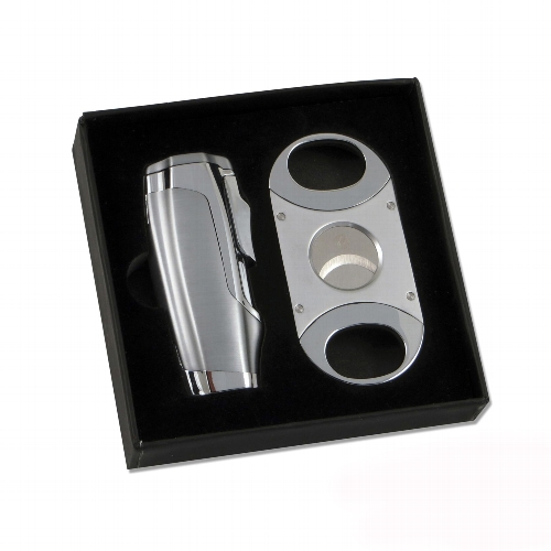 Sky ezüst színű, króm, 3 db szúrólánggal égő szivar öngyújtó és szivarvágó szett.