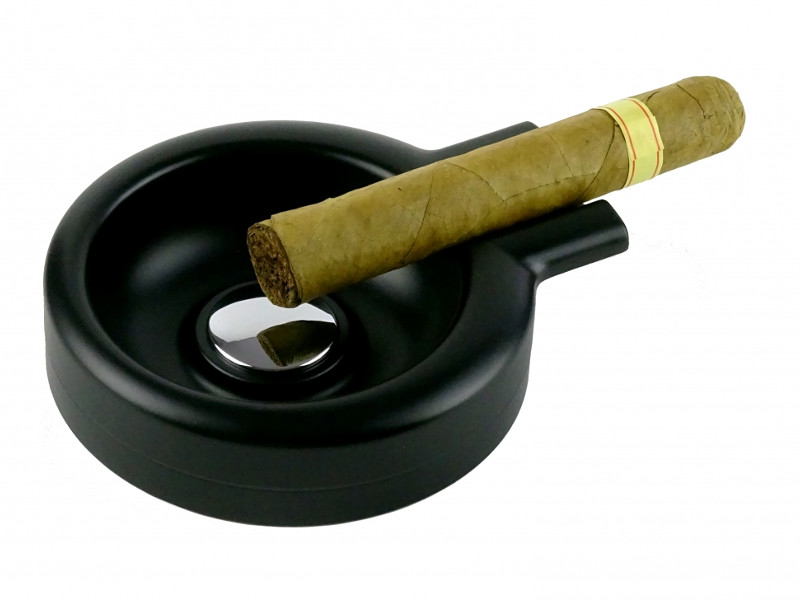 fémből készült, matt fekete színű, kerek szivar hamutartó, 1 szivarnak elegendő hellyel.