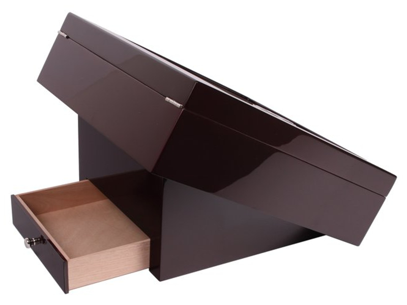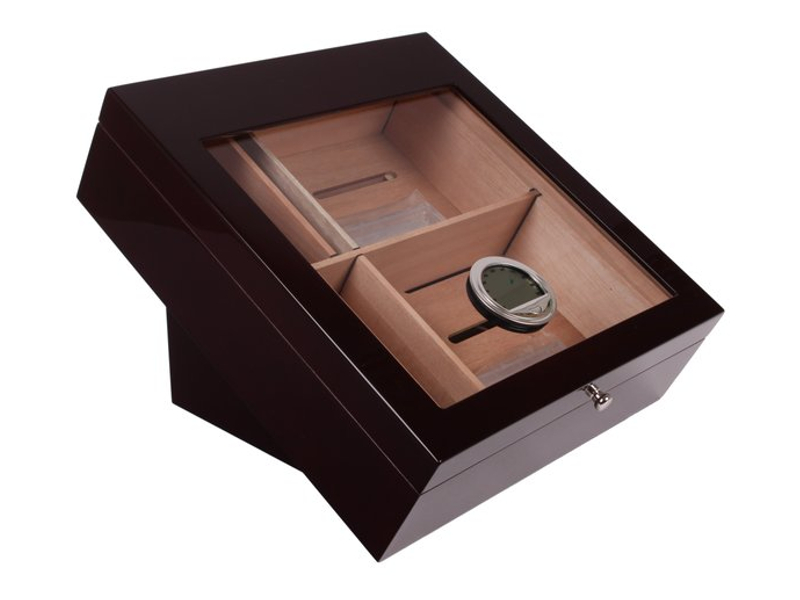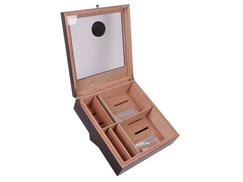 Álló fogadásokhoz, vendégek kínálásához javasolt nagyméretű, kb. 80-100 szál szivar tárolására alkalmas, cédrusfa humidor, üveg tetővel, magasfényű, lakkozott. Több fakkra osztott. A szivarkellékek tárolására a hátuljából kihúzható kis fiókkal.
