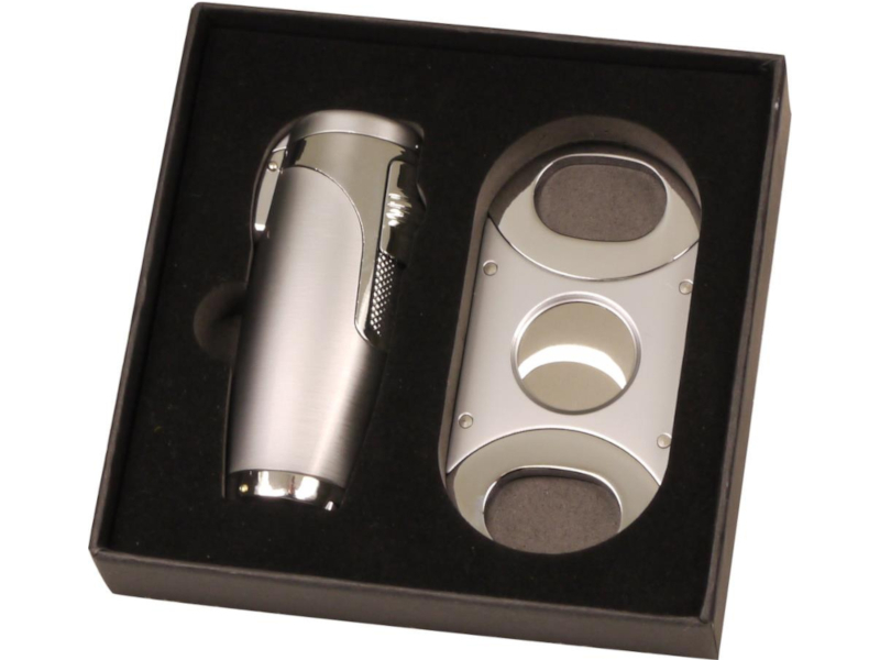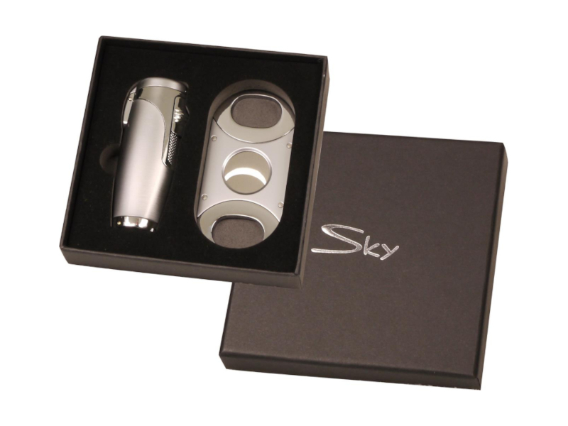 AJÁNDÉK szett tartalmaz: egy krómozott Sky öngyújtót erőteljes hármas szúrólánggal, amelynek aljából kihajtható egy 7 mm-es szivarfúró, valamint egy hozzá illő szivarvágót, amely 22 mm-es szivarok vágására alkalmas.
