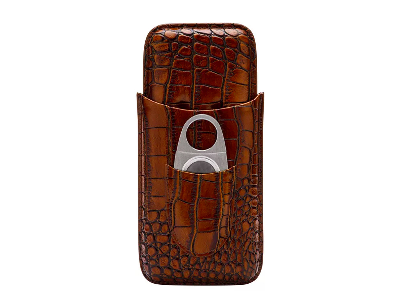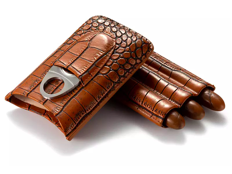 Barna színű, krokodil-mintás dombornyomott bőrből készült elegáns szivartok + Szivarvágó. 3 szál Double Corona méretű szivar biztonságos szállítására alkalmas. A szivartok egymásba csúsztatható, és magasságuk a megfelelő formátumhoz igazítható, így biztosít megfelelő tárolóhelyet a kedvenc szivarjainak utazás közben is. Három kerek hüvelyt tartalmaz, amelyek egyenként elválaszthatják a szivarokat szállítás közben. Állítható hosszúságú, akár 20 cm (akár 50-es gyűrűméretű) szivarokat is tárolhatunk benne.