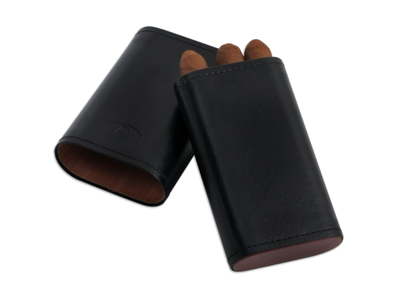 Fekete színű bőrből készült szivartok, 3 szál szivar tárolására alkalmas, spanyol cédrusfa belsővel.