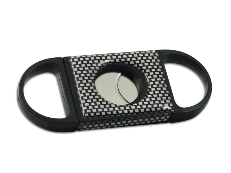 Rozsdamentes acélból készült, kétélű, fekete színű Carbon-hatású műanyag szivarvágó. 20 mm-es átmérőjű szivarok vágására alkalmas.