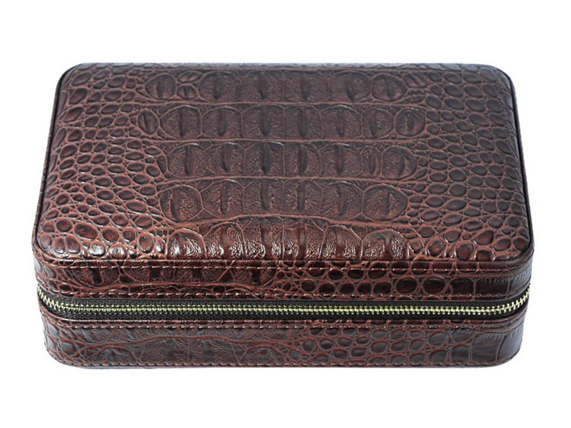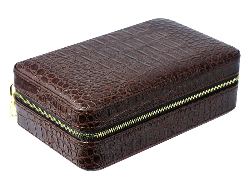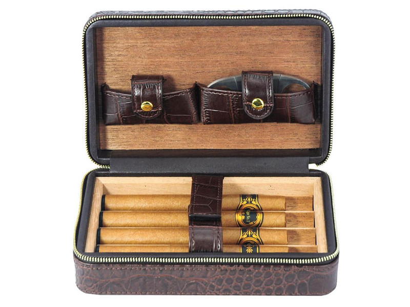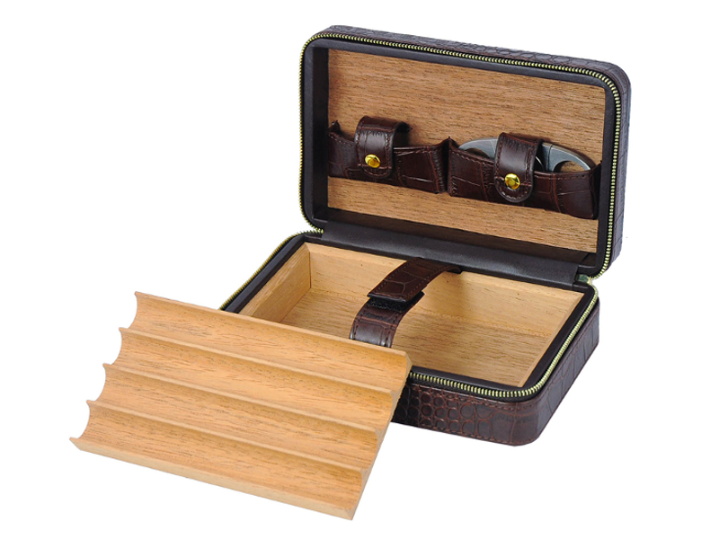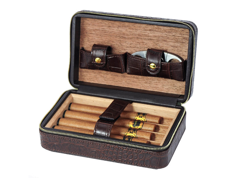 Sötétbarna színű, bőr borítású kis méretű, rendkívül robusztus és szilárd szerkezetű szivar tartó doboz, amely 4 szivar tárolására alkalmas, cédrusfa belsővel. Prémium krokodil dombornyomott bőrből készült, mely elegáns, fényes, stílusos és tartós. Az U-alakú, masszív, strapabíró spanyol cédrusfa tálcán egyenként tárolhatja szivarjait. Frissen tartja a szivarokat, megőrzi az aromájukat, a bőrszíj pedig stabilan tartja szivarjait.