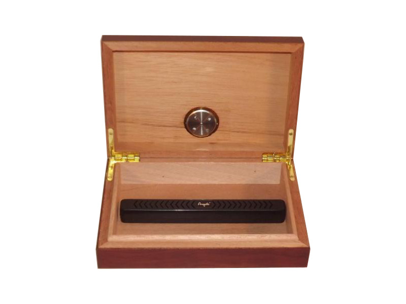 Barna színű szivar tartó doboz, amely kb. 5 szivar tárolására alkalmas, cédrusfa belsővel.