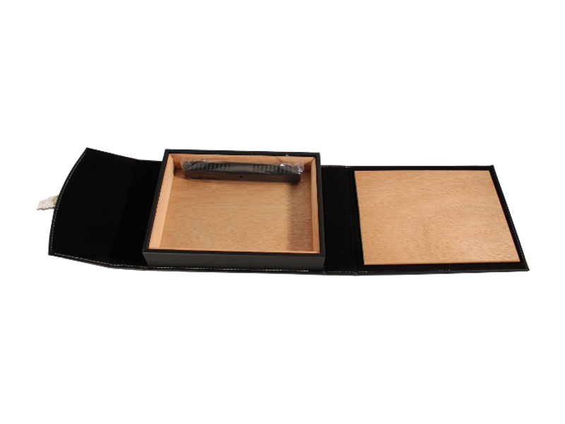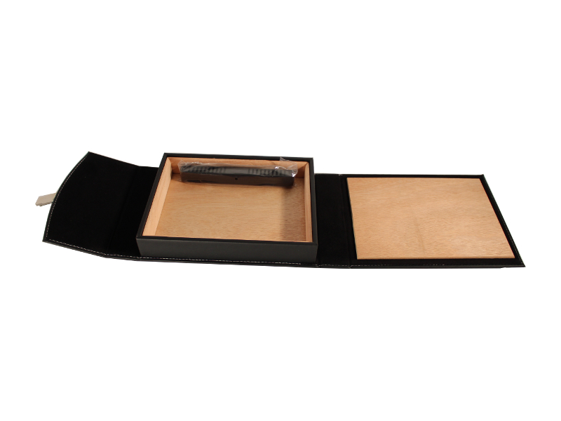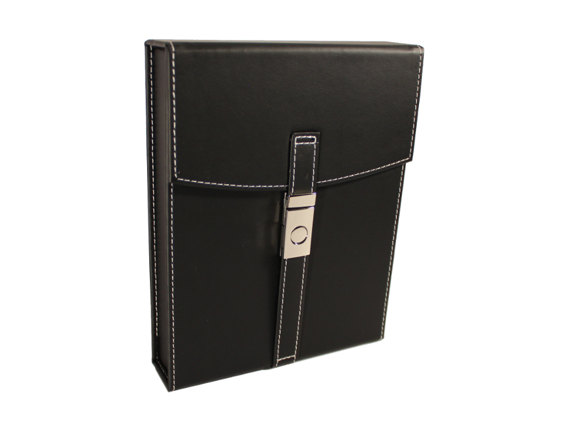 Fekete színű, finom bőr borítású spanyol cédrusfa szivar tartó doboz, pántos, kb. 10-15 szivar tárolására. Utazáshoz ajánljuk.